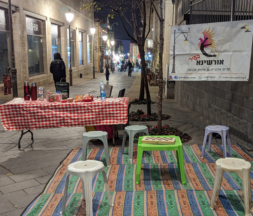 2. "אורשינא בעיר" הוא מעין "קו סיוע" שיזמנו כדי לאתר את הנערים ברחוב ולשתפם בתוכנית. ערב אחד בשבוע אנחנו יוצאים לכיכר ציון ומקימים מרחב להנגשת ידע על פגיעה מינית. הרבה שיחות מתחילות משאלות גישוש. לעיתים הן מסתיימות בהיכרות חד־פעמית ולפעמים הנער חוזר -ויכול להתחיל תהליך של ליווי מקצועי.